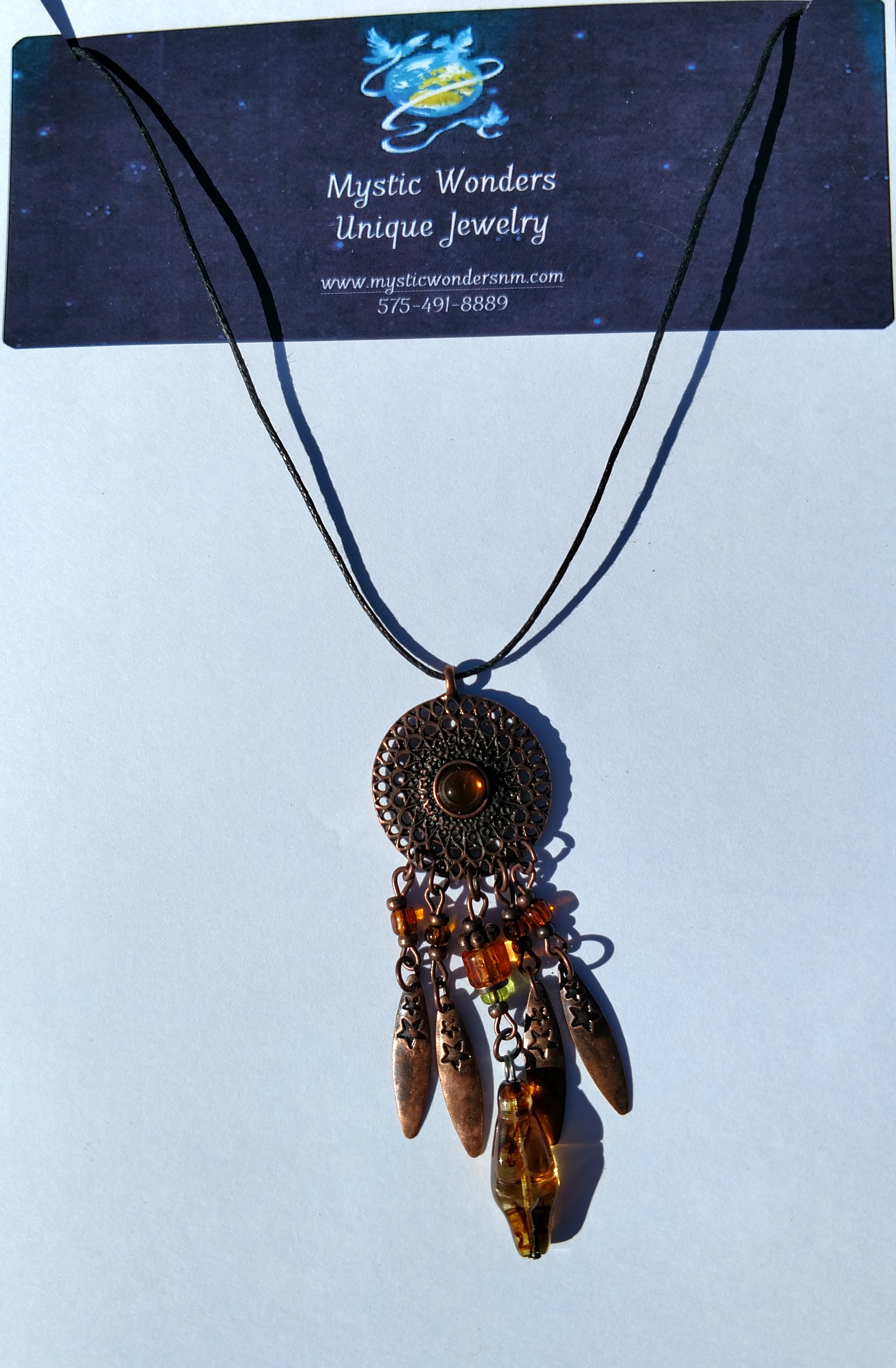 This is a beautiful one of a kind pendant. Brass mandala, feathers with Amber colored beads on a black cotton adjustible cord.