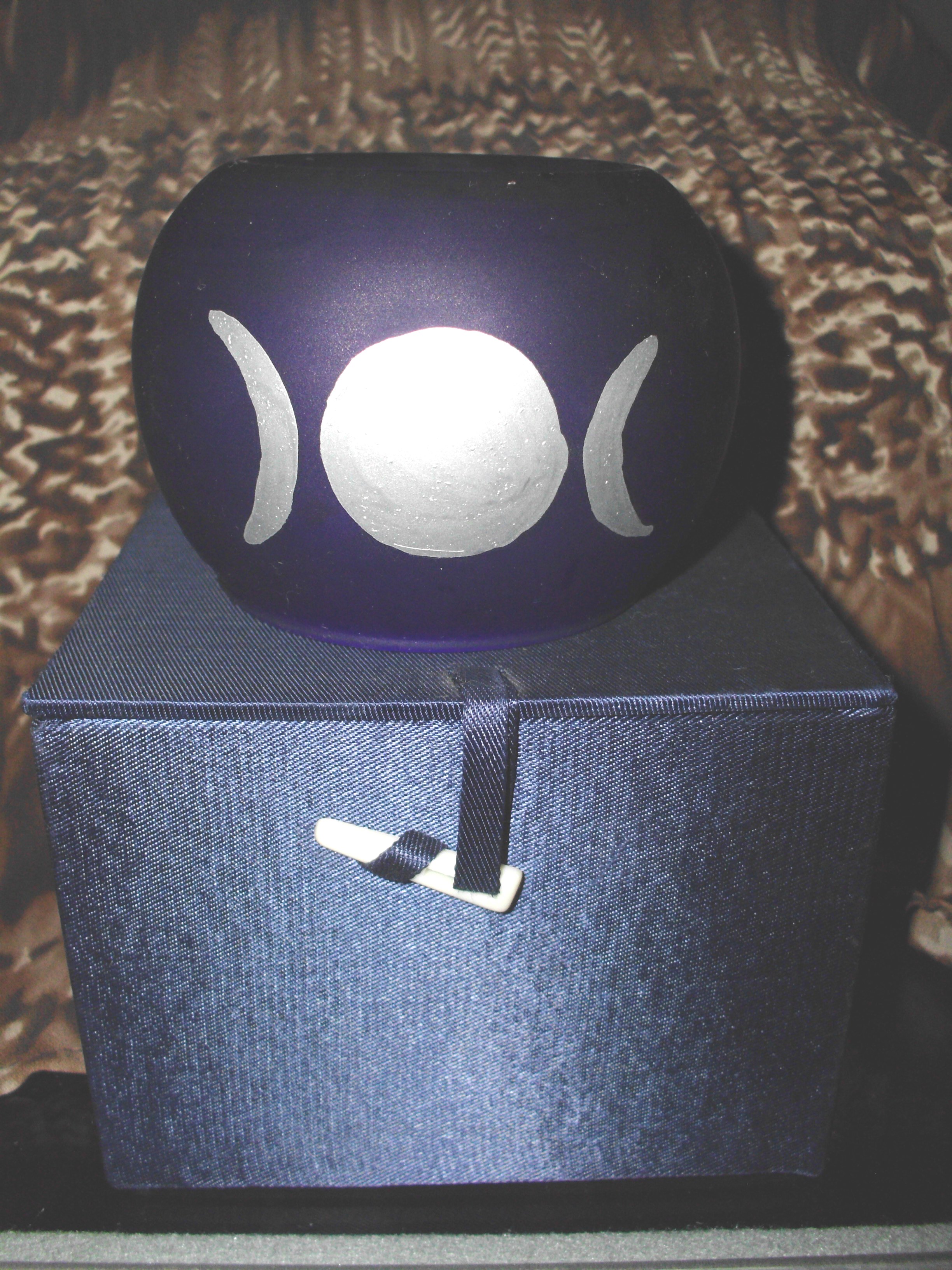 Blue Frosted glass tealight holder w/box. This is a hand painted round frosted glass holder with the symbol of the triple moon. This comes in a beautiful storage box. Approximately 4" around.
